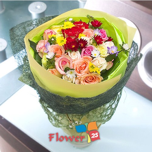 색색의 장미 사이상이 과꽃을 꽂아 화려하면서도 소박한 느낌으로 누구에게나 부담스럽지 않게 선물할 수 있습니다.