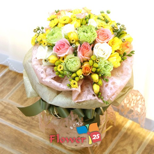 슈퍼그린과 노란후리지아사이에 버실리아와 트윈의 조화는 가장 아름다운 배합이라해도 손색이 없습니다 더구나 연핑크의 한지로 감싸고 부케를 연상시키는 어렌지는 플라워25 전문 플로리스트가 귀중한 분께 드리는 최상의 작품이라고 적극 추천합니다