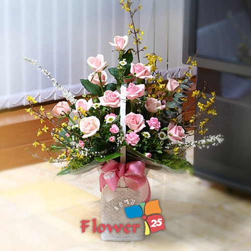 ▶ 소재 버실리아, 엔젤카네이션, 개나리, 그린소재, 실크리본, 백소국 ▶ 사이즈 가로35cm x 세로55cm ▶ 작품설명 버실리아의 은은한 느낌을 엔젤카네이션과 개나리가 어렌지하면서 소박한 느낌을 자아내는 작품입니다 개나리는 왕버들이나 곱슬버들로 대체가 가능합니다 또한 밑부분을 몬스테라가 받쳐주니 키다리 사각바구니가 안정감을 주는 플라워25 플로리스의 아이디어가 돋 보입니다