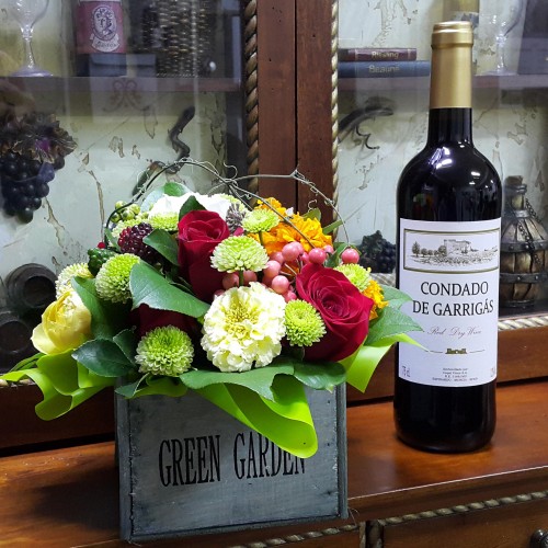 꽃바구니와 와인 세트 구성입니다.